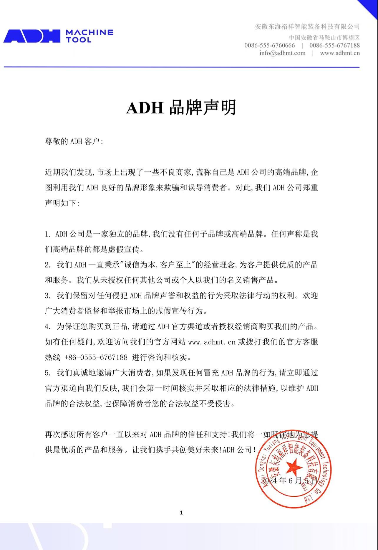 最近,我們發現市場上有一些不良商家 謊稱是 ADH 機床的高端品牌,企圖利用 "ADH "良好的品牌形象欺騙和誤導消費者。對此,我們 ADH 公司在此鄭重聲明如下: